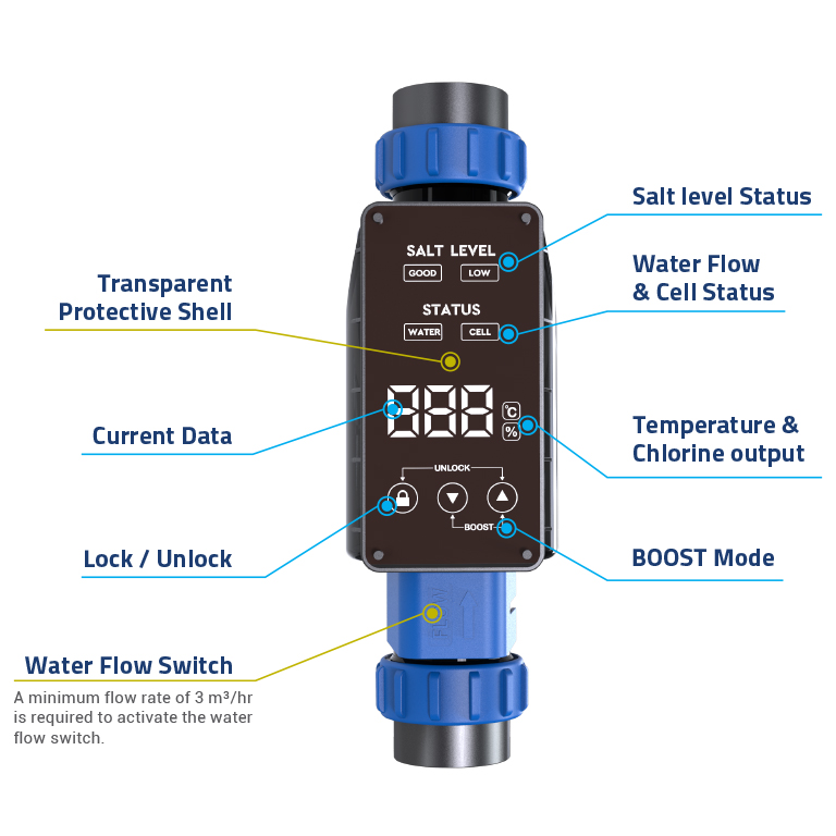 The SSCnano+ is an innovative in-line salt chlorinator that seamlessly synchronizes with the pump. Offering 12 chlorine production modes, it provides complete control over the chlorination process. Integrated features like a water flow switch, salinity monitoring, and water temperature tracking enable responsive pool management. Its innovative technology also includes a cell run-time meter. Enjoy the benefits of long cell life and reduced chemical usage, thanks to its efficient and environmentally friendly design. Compact and user-friendly, the SSCnano+ revolutionizes chlorine generation.