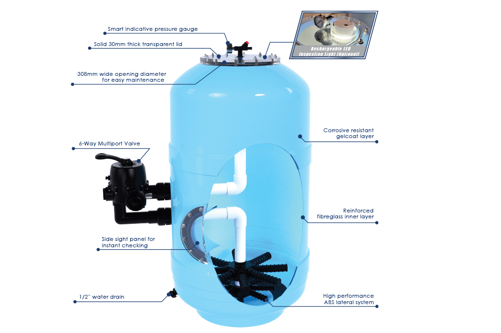 The Emaux wide opening gelcoat Filter is an outstanding sand filter for swimming pool enthusiasts. Its flawless gelcoat surface is not only aesthetically pleasing but also resistant to corrosion. The specially deepened sand layer enhances water clarity, while the transparent wide filter cover and side view panel simplify monitoring, ensuring optimal filter maintenance. Equipped with the reliable and durable Emaux 6-way valve, this laminated filter stands out as one of the most advanced sand filters available. valve, this laminated filter stands out as one of the most advanced sand filters available.